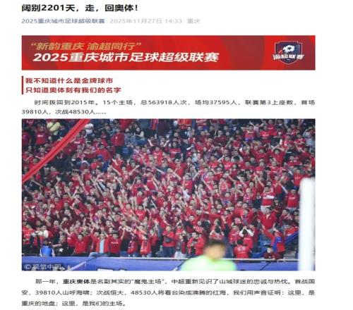 “渝超”官方微信公众号官宣12月6日重回奥体。图片来源/“渝超”组委会