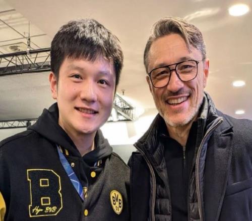 樊振东在社媒发布动态。他与德国名将波尔又一起观看了足球比赛,并与多特蒙德的主帅合影。樊振东谈笑风生,非常开心。