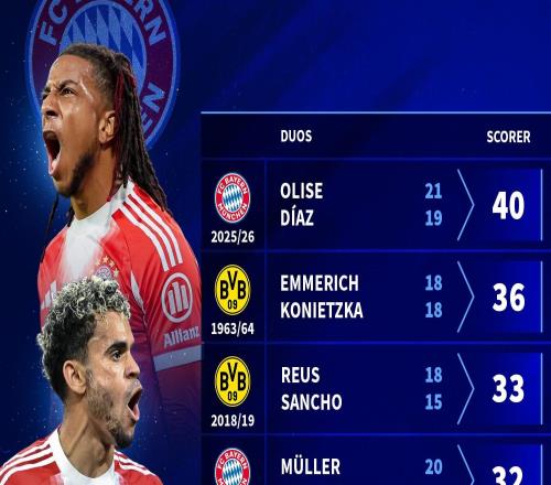 北京时间1月15日,在拜仁慕尼黑以15胜2平的不败成绩成为本赛季德甲半程冠军之后,来自德转的统计指出,奥利塞和路易斯-迪亚斯也以直接参与40球成为了德甲历史上半程直接参与进球