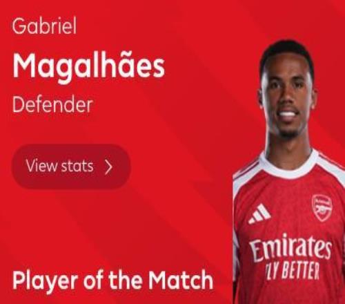 定海神针,加布里埃尔当选阿森纳vs埃弗顿全场最佳球员